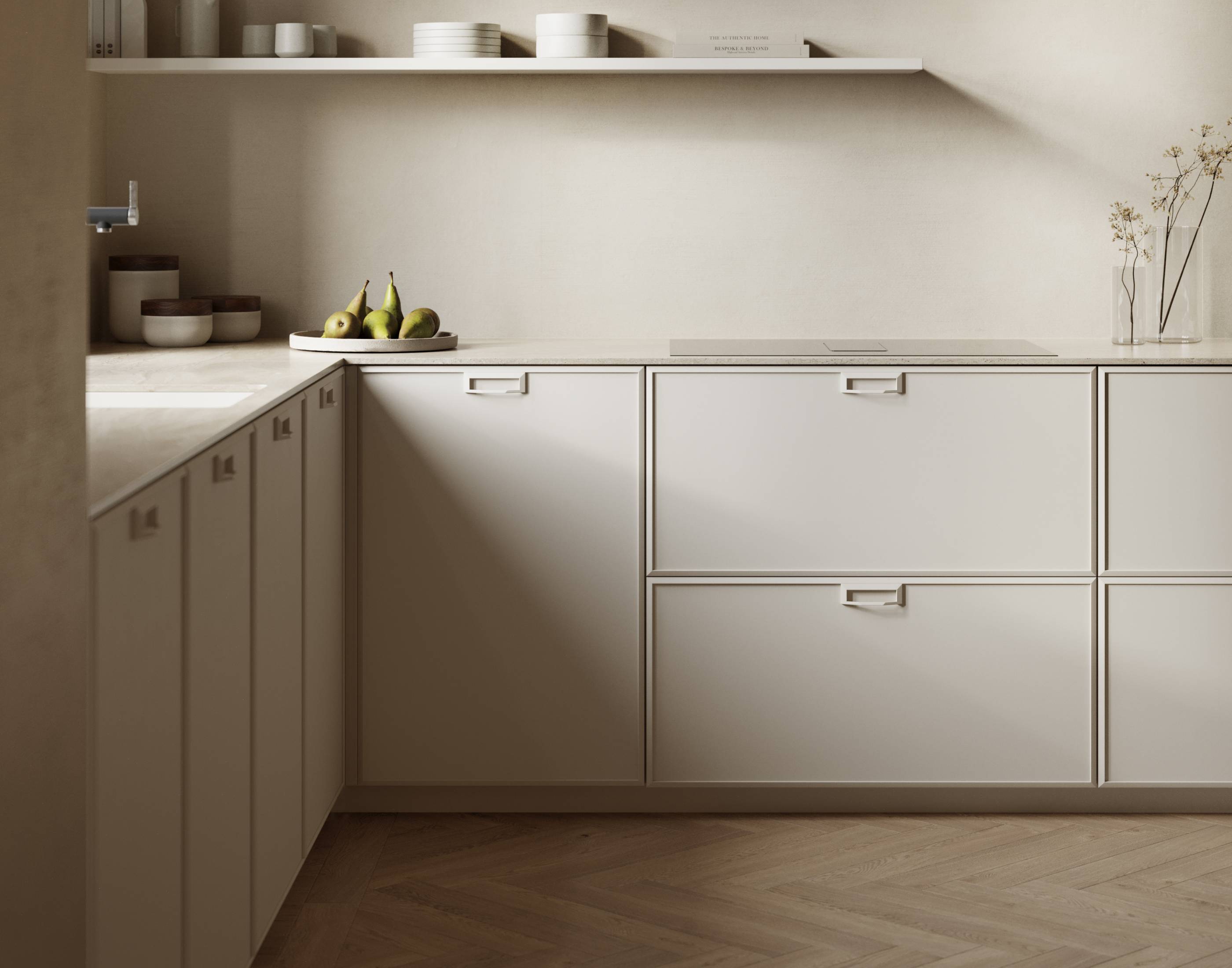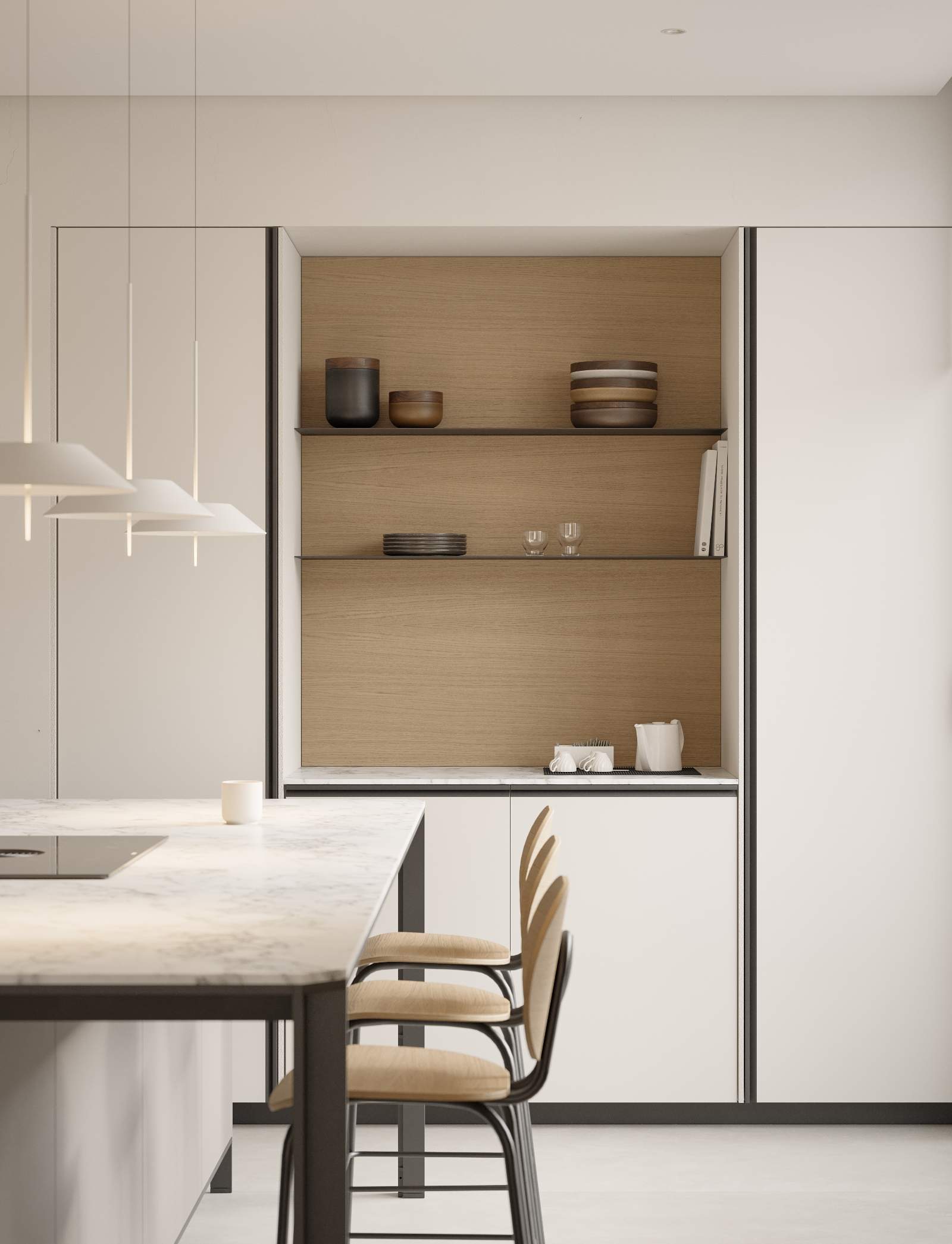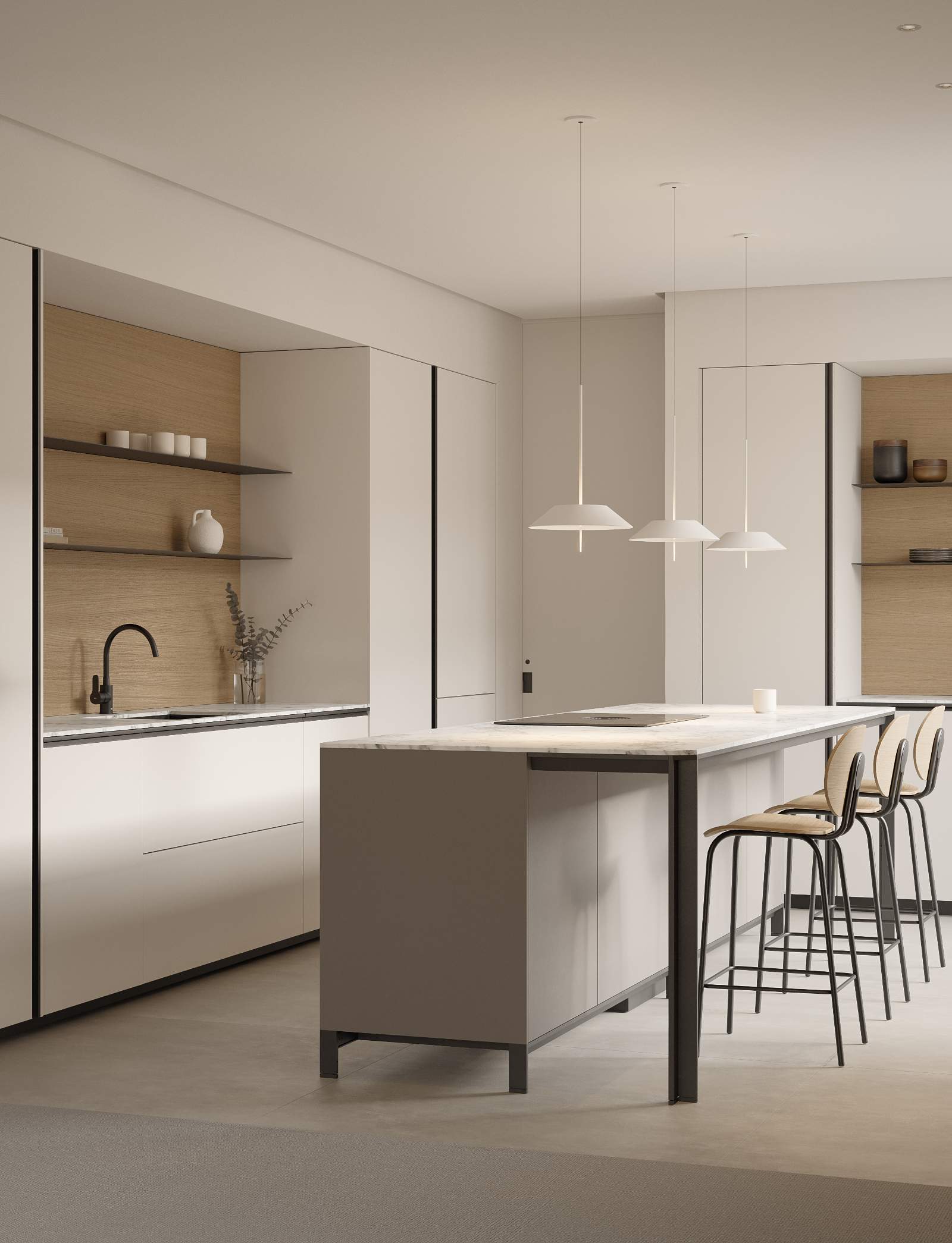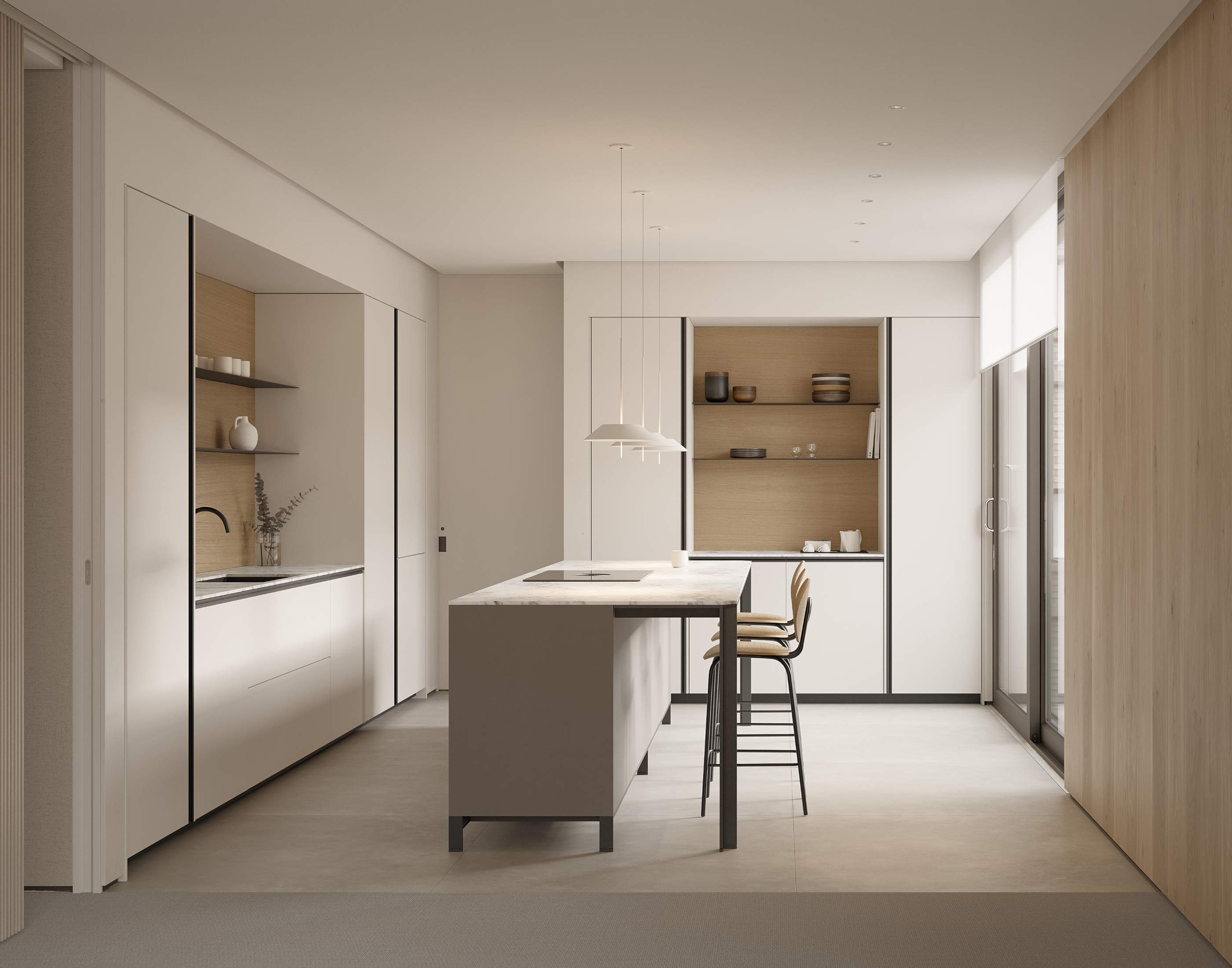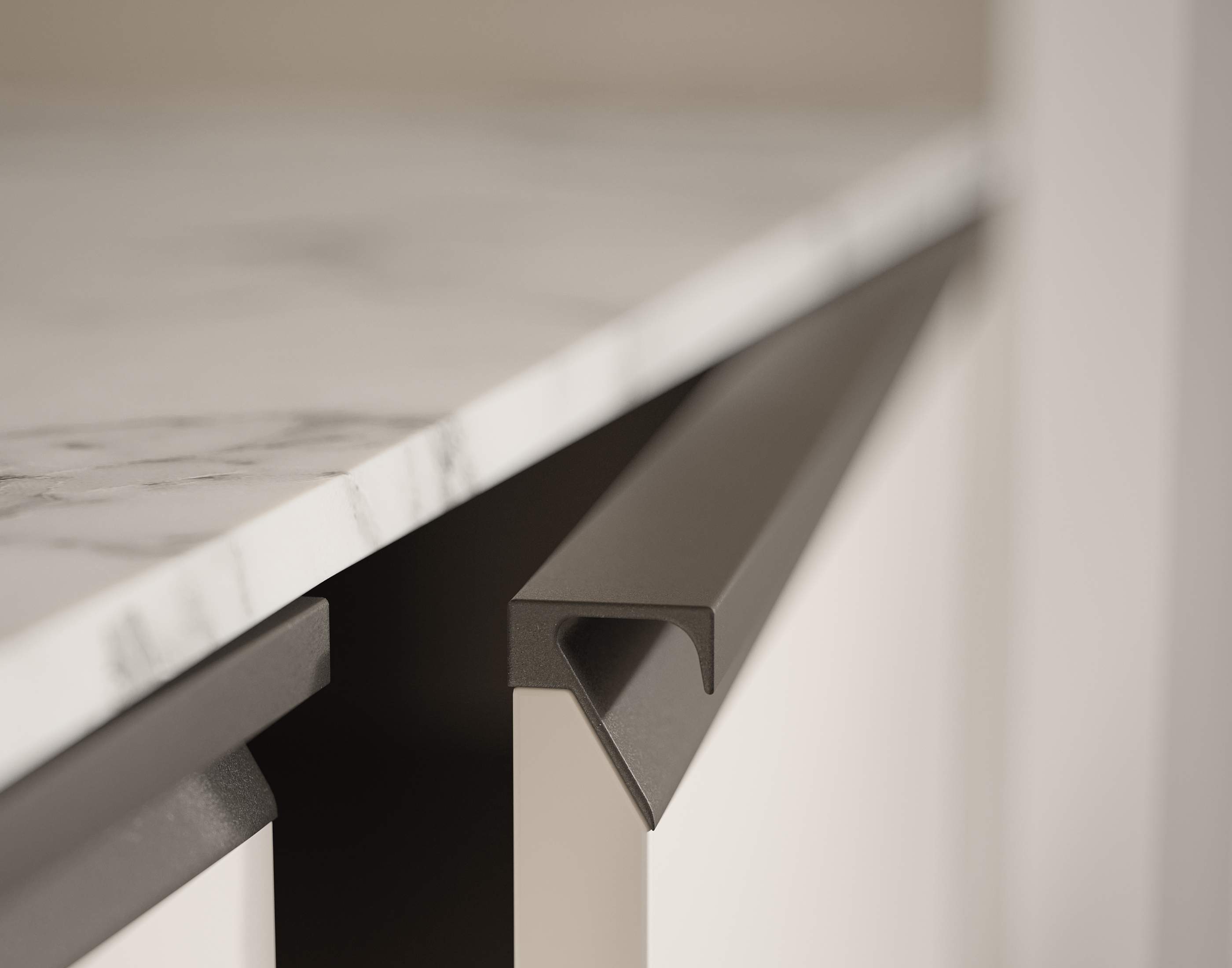 El tirador puede integrarse en el color de la puerta o combinarse con los elementos metálicos como bancada y snack, ofreciendo así un sinfín de variaciones.