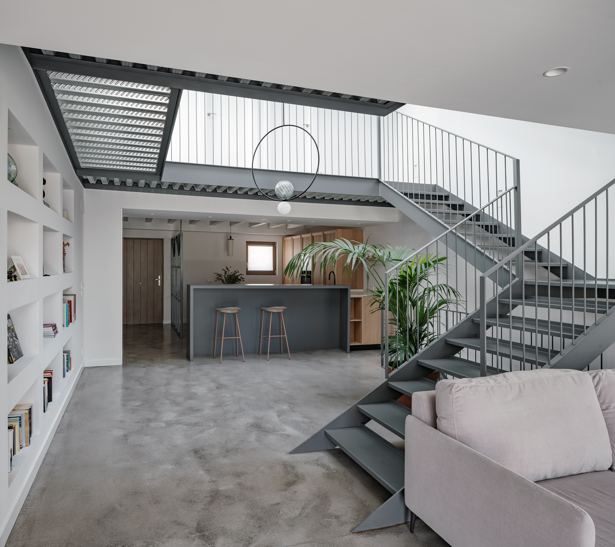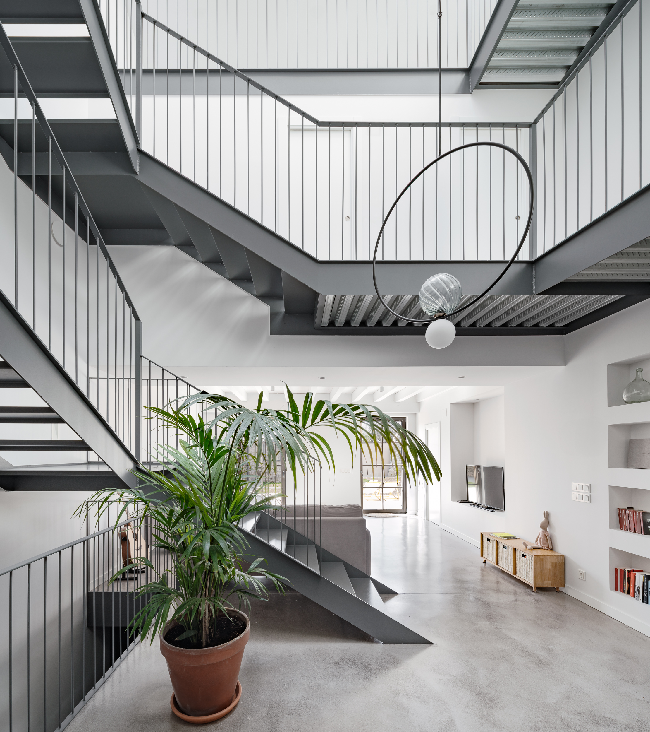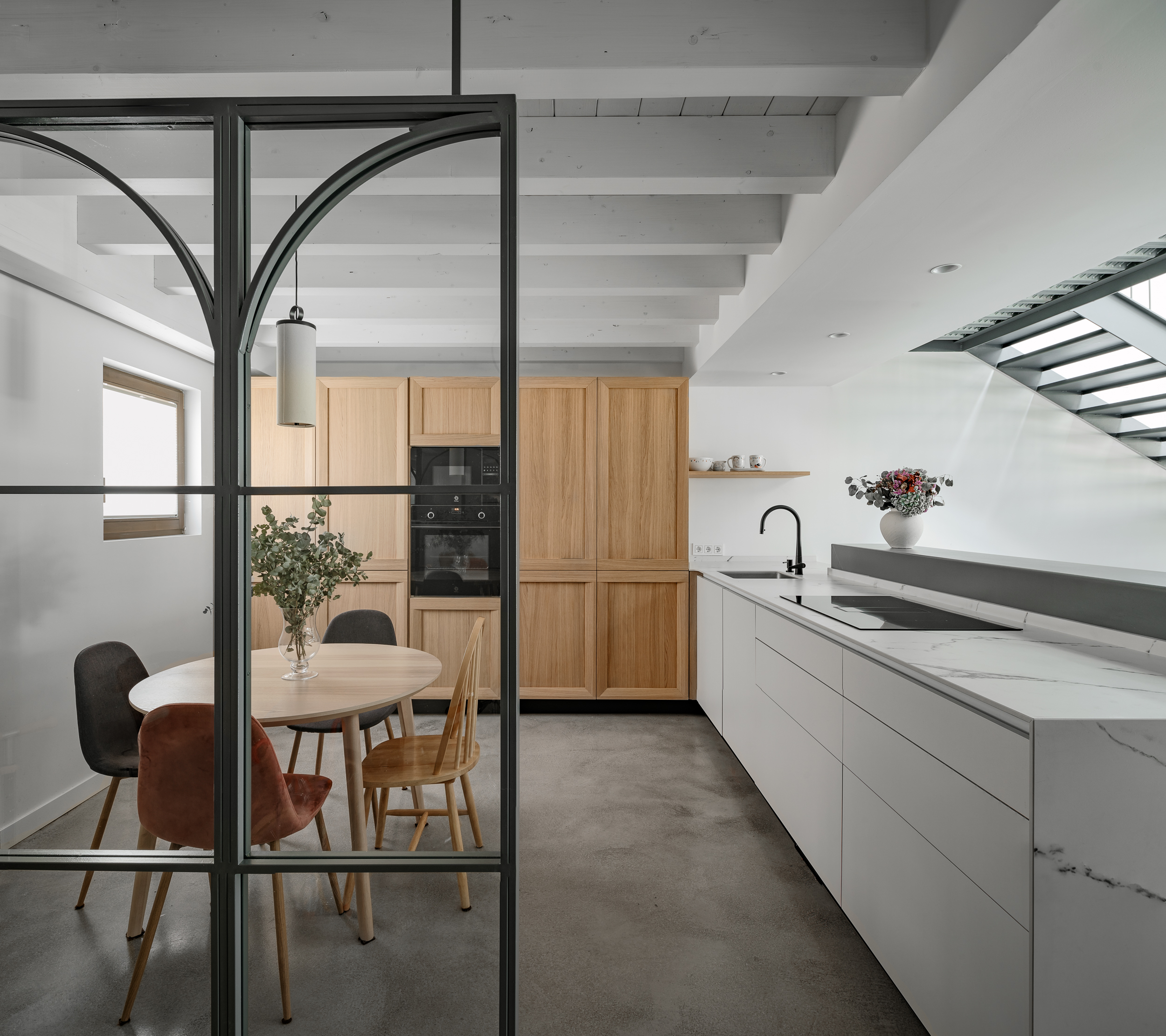 Desarrollada en un solar estrecho, la vivienda se organiza en torno a un atrio central que estructura los espacios y favorece una distribución fluida y luminosa. En este contexto, la cocina se integra de forma natural, apostando por líneas depuradas, materiales honestos y una funcionalidad pensada para el día a día.